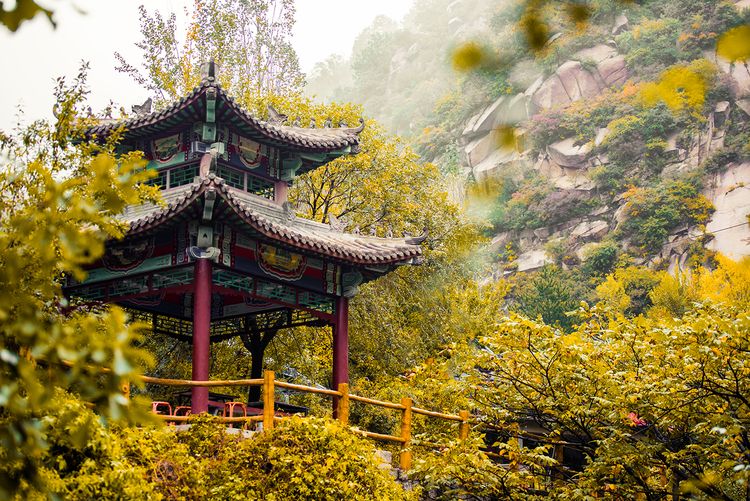 十瀑峡的秋意来得更加让人陶醉,古香古色的凉亭掩映在一片金色秋叶之中,却是有着另一种韵味。 濛濛细雨之中让山谷间云雾缭绕,若隐若现之间可以看到四周山石林立,不时刮来的阵阵秋风让树叶漱漱作响,似乎是在告别,又像是在怀念。 尽管早已打定主意先进入到景区深处,但半路上的秋意依然让我忍不住停下来拍摄了好几张照片,这里的山体和白石山是一样的石质,因此显得整个画面不会过于沉闷。 |